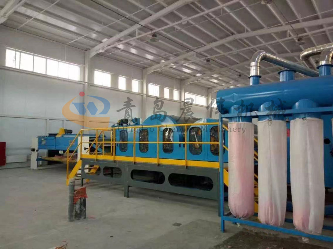 2. CWKS-開松機(jī):各種不同纖維被放入水平輸送簾,經(jīng)壓棉輥和對輥羅拉喂入,經(jīng)高速打手開松后經(jīng)輸棉風(fēng)機(jī)以適量的風(fēng)量輸送纖維原料供后道工作使用;并配備橋式除鐵裝備。開松效果好,不易纏棉,產(chǎn)量高。