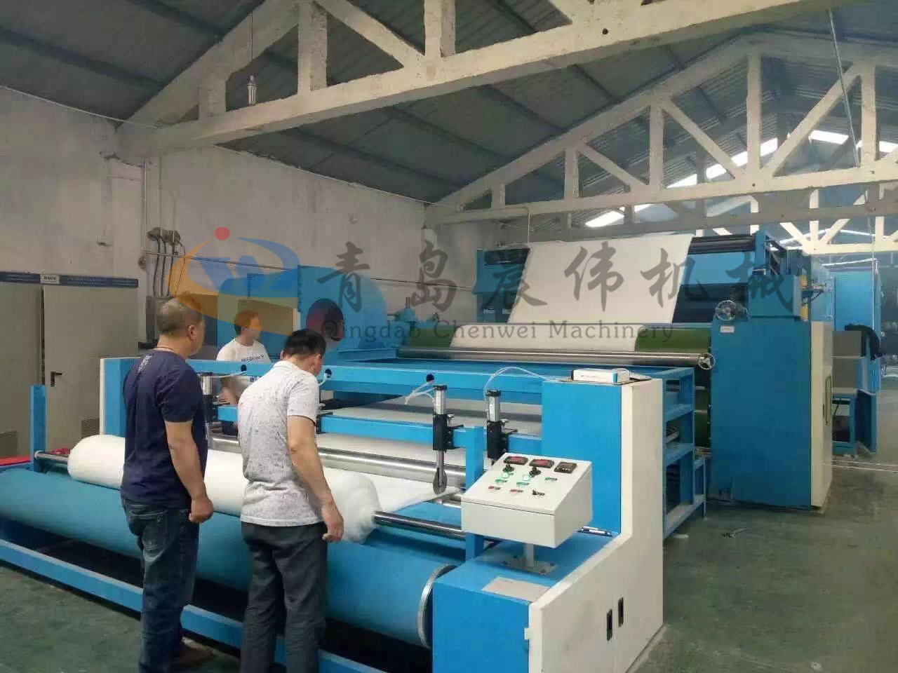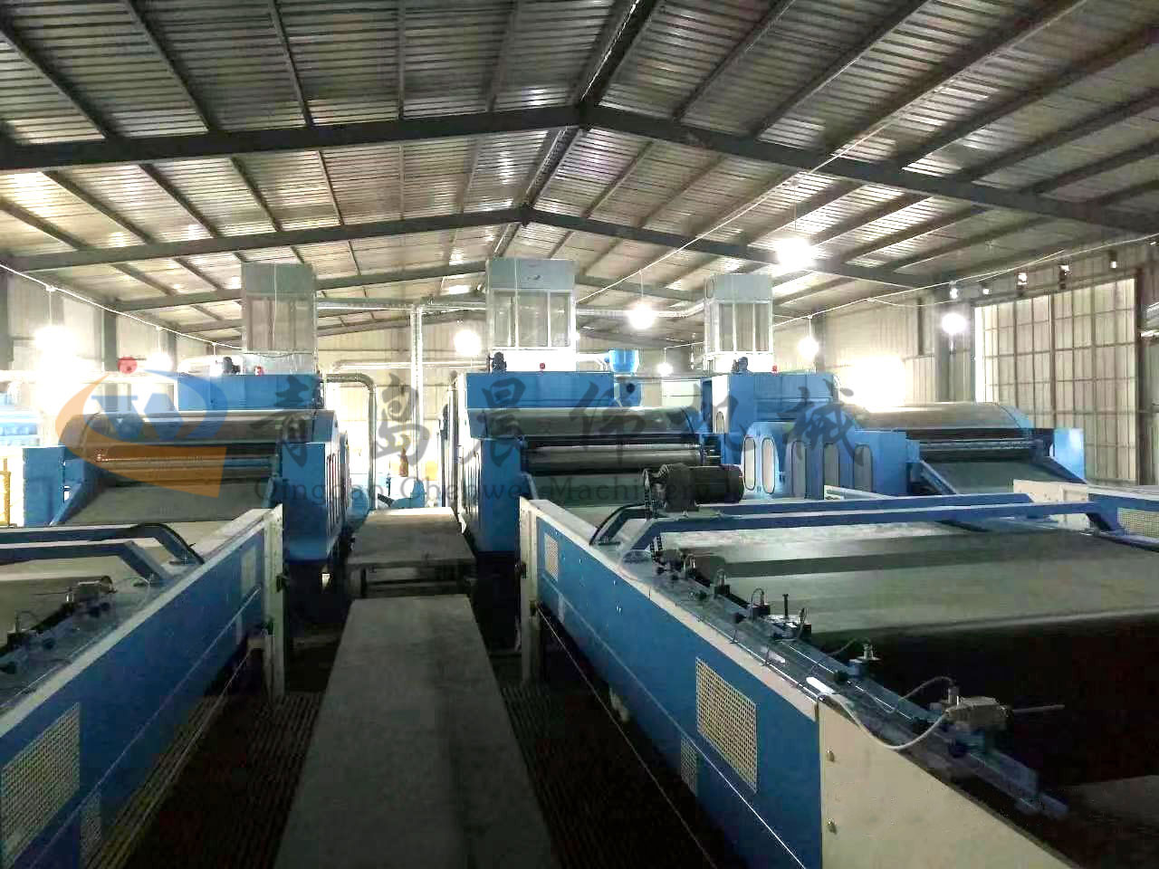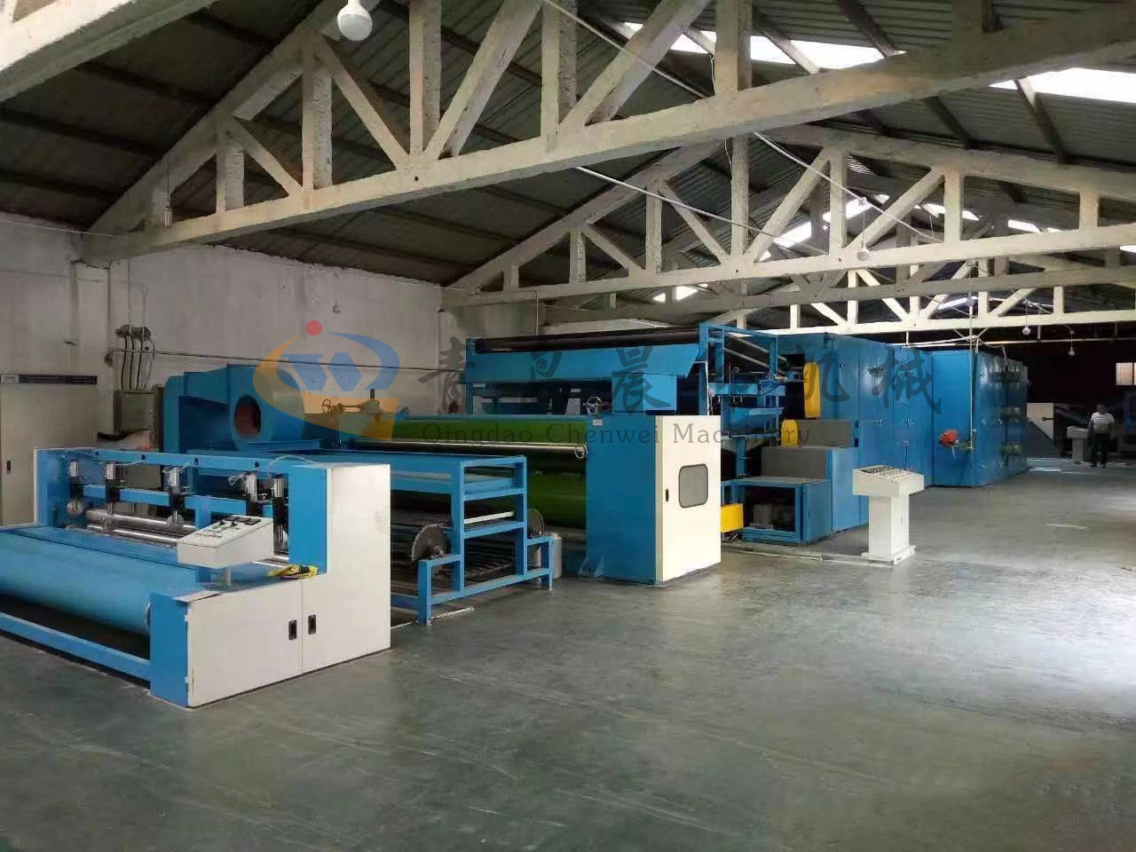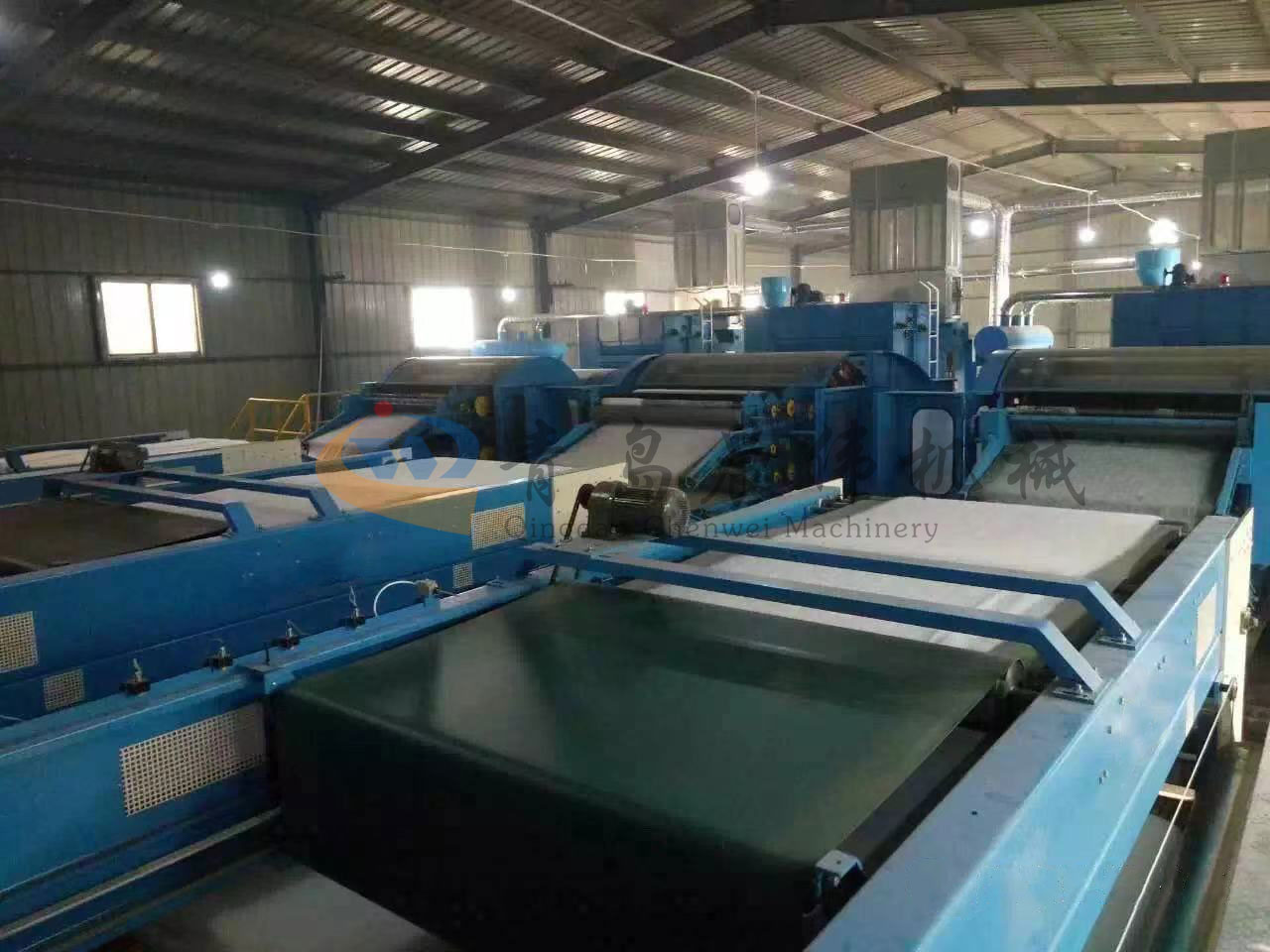 5. CWPW-鋪網(wǎng)機(jī):用于將梳理纖網(wǎng)通過移動(dòng)小車交叉折疊為所需幅寬和定量的多層纖網(wǎng),以供后道工序使用。鋪網(wǎng)輥采用特殊結(jié)構(gòu),加裝壓網(wǎng)輥和導(dǎo)流板,不飄網(wǎng)不起皺,五只大功率電機(jī)精確控制各部件的運(yùn)動(dòng),電動(dòng)輸出簾高度調(diào)節(jié)裝置。