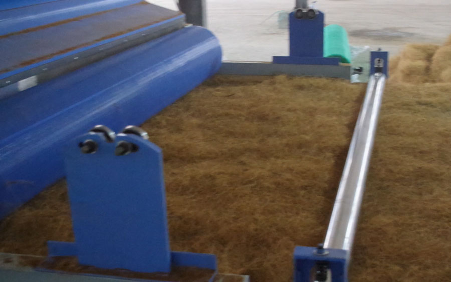 本生產(chǎn)線是利用椰棕纖維和膠水通過(guò)高溫?zé)犸L(fēng)穿透粘合定型,通過(guò)壓板機(jī)多層壓實(shí)而成,椰棕墊是床上用品、服裝家具、沙發(fā)高級(jí)的芯墊材料。
